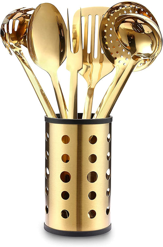 Marco Almond® Kitchen Utensil Set, KYA51B Stainless Steel Cooking Utensils Sets with Titanium Plated, 7 PCS Kitchen Gadgets, Turner, Serving Spoon, Ladle, Skimmer Spoons, Fork, Pasta Server and Holder, Gold