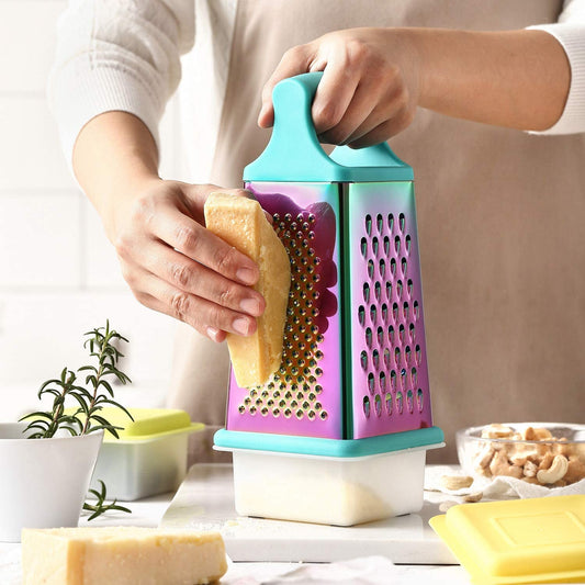 Convenient and Easy to Use:Using this box grater can give you convenience while using it. You can easily grip the handle at the top to make it safe and secure while grating. Moreover, it has a soft silicone base to stabilize the grater while using it. The design is also concave for a comfortable and easy grating. Now you can chop, julienne, and slice your fruits and vegetables with ease and less time. This is certainly a great addition to your kitchen tools to make cooking fast.